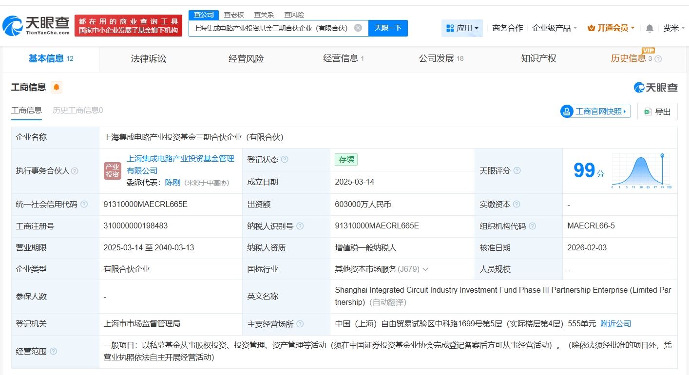 南方财经2月10日电,天眼查App显示,近日,上海集成电路产业投资基金三期合伙企业(有限合伙)发生工商变更,新增上海国投先导集成电路私募投资基金合伙企业(有限合伙)、上海浦东引领区投资中心(有限合伙)为合伙人,同时出资额由5.3亿人民币增至60.3亿人民币,增幅约1038%。该基金成立于去年3月,执行事务合伙人为上海集成电路产业投资基金管理有限公司,经营范围为以私募基金从事股权投资、投资管理、资产管理等活动,现由上海国有资本投资有限公司、上海集成电路产业投资基金管理有限公司及上述新增合伙人共同出资。