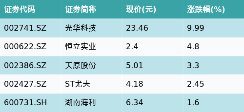 截至收盘,正极材料主题涨跌幅最高的五只股票为:光华科技(002741.SZ)、恒立实业(000622.SZ)、天原股份(002386.SZ)、ST尤夫(002427.SZ)与湖南海利(600731.SH)。详情见下表: