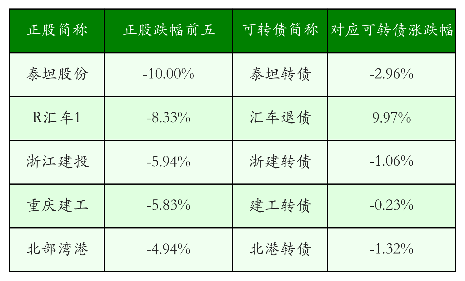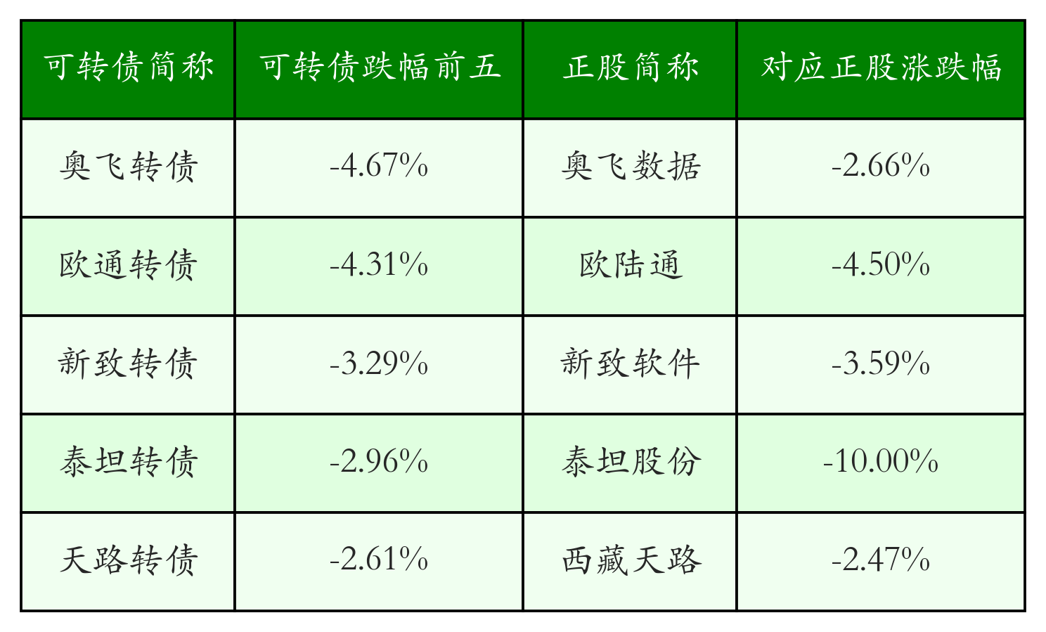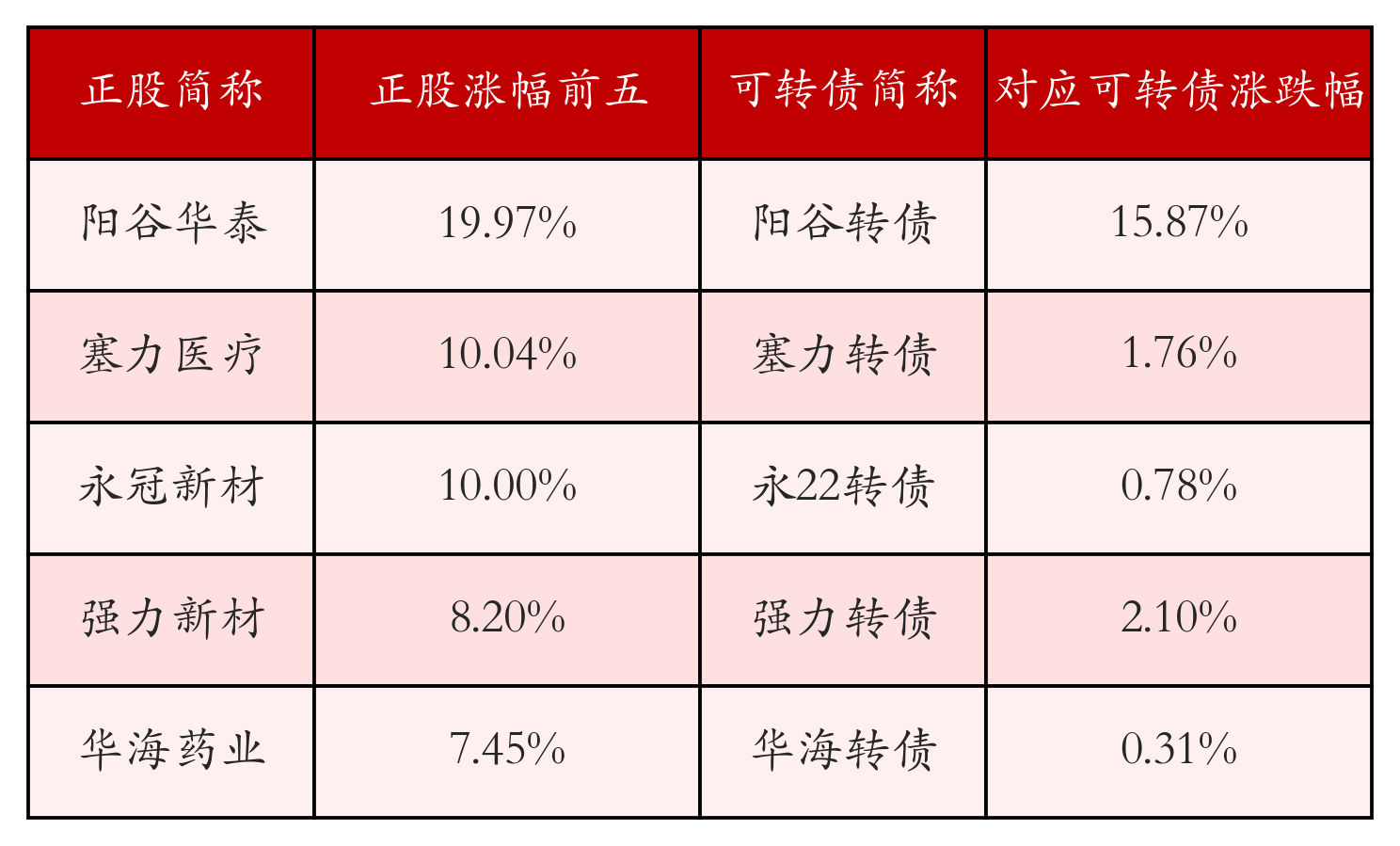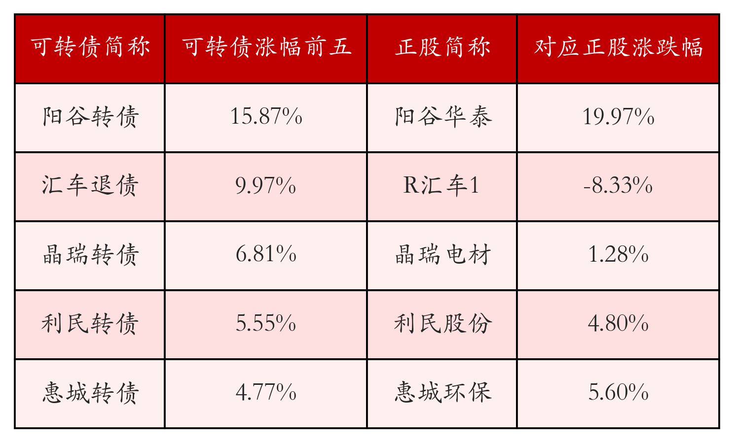 南财智讯5月23日电,南财金融终端盘后数据显示,债市方面,中证转债指数收跌0.31%,报428.34,成交额为555.99亿元。可转债方面,今日共成交472只可转债,其中115只收涨,2只收平,355只收跌。具体来看,16只可转债涨幅超过2%。其中阳谷转债(123211)涨15.87%,汇车退债(404004)涨9.97%,晶瑞转债(123031)涨6.81%。今日有10只可转债跌幅超2%,奥飞转债(123131)跌4.67%,欧通转债(123241)跌4.31%,新致转债(118021)跌3.29%。存在交易量的可转债所对应的正股中,89只收涨,11只收平,372只收跌。具体来看,7只可转债对应正股涨幅超过5%,其中,阳谷华泰(300121)涨停,收涨19.97%;塞力医疗(603716)涨停,收涨10.04%;永冠新材(603681)涨停,收涨10.0%。同时所对应的可转债:阳谷转债(123211)同涨15.87%;塞力转债(113601)同涨1.76%;永22转债(113653)同涨0.78%。今日有4只可转债对应正股跌幅超过5%,泰坦股份(003036)跌停,收跌10.0%。同时所对应的可转债:泰坦转债(127096)同跌2.96%。