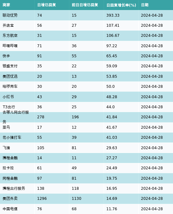 黑猫投诉:联动优势、开店宝和东方航空4月28日投诉回复增速最高
