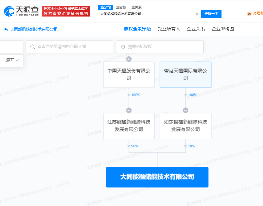 南方财经9月28日电,天眼查App显示,近日,大同能楹储能技术有限公司成立,法定代表人为陆平,注册资本5亿人民币,经营范围包括储能技术服务、发电技术服务、太阳能发电技术服务、风力发电技术服务等。股权全景穿透图显示,该公司由如东锦楹新能源科技发展有限公司、江苏能楹新能源科技发展有限公司分别持股10%、90%,后者为中国天楹(000035)全资子公司。