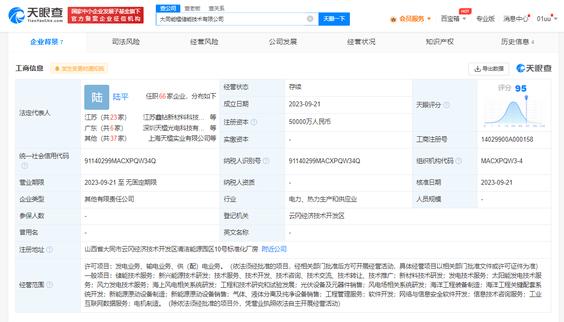 中国天楹在大同成立储能技术公司 注册资本5亿