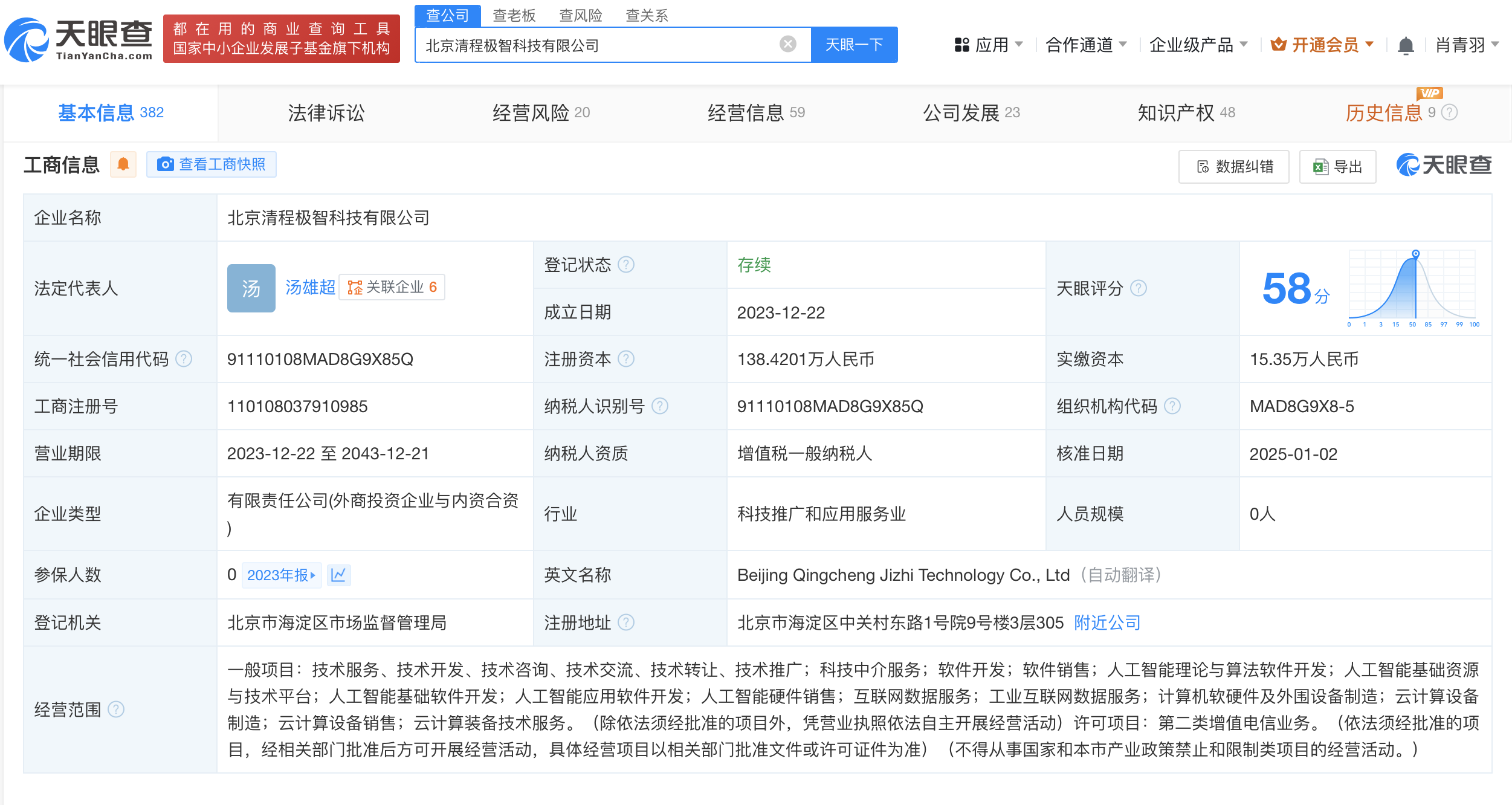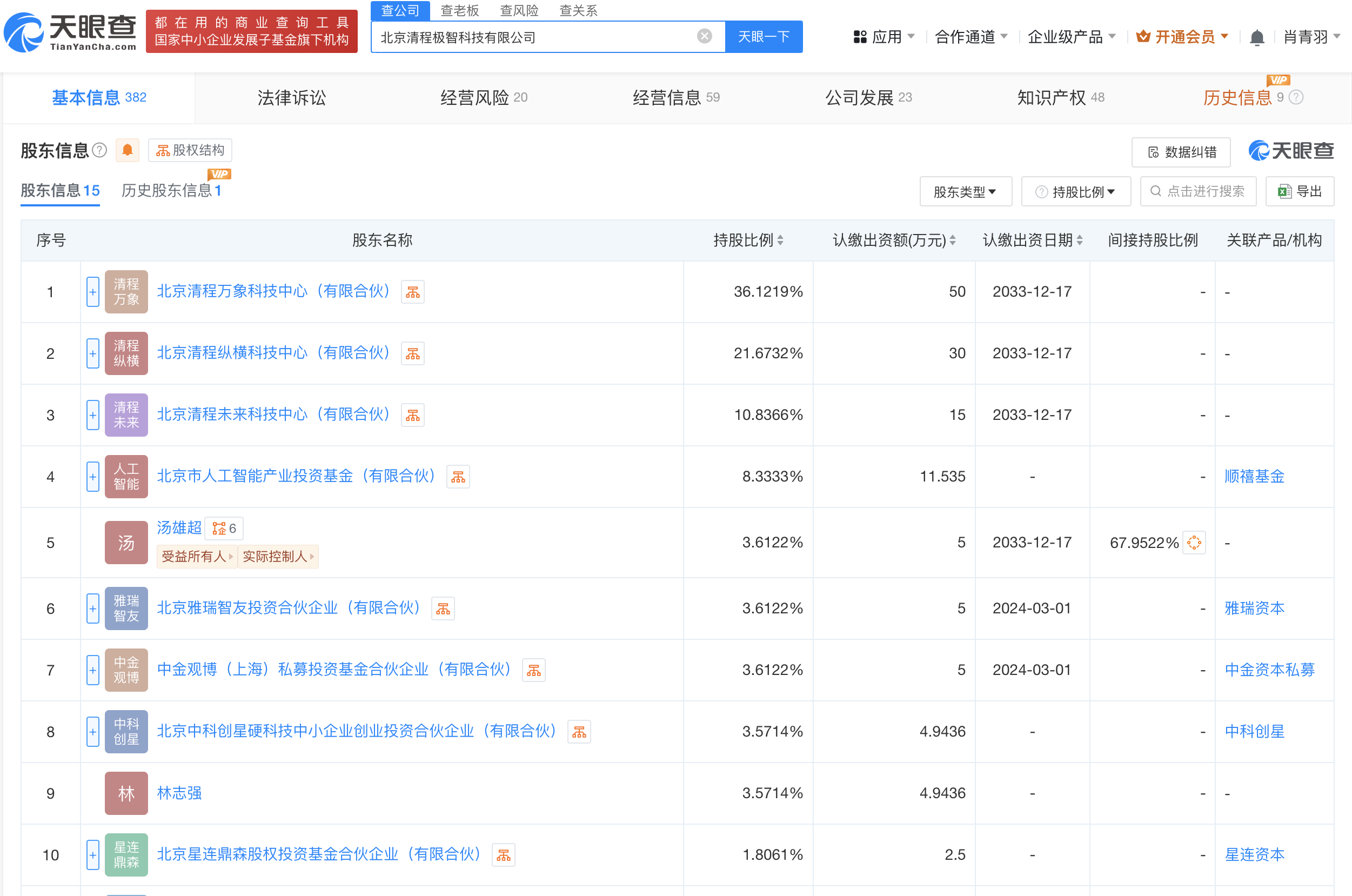 南方财经1月21日电,天眼查App显示,近日,北京清程极智科技有限公司发生工商变更,智谱AI关联公司北京智谱华章科技有限公司退出股东行列,新增北京市人工智能产业投资基金(有限合伙)、北京中科创星硬科技中小企业创业投资合伙企业(有限合伙)、北京考拉鲲鹏科技成长基金合伙企业(有限合伙)等,注册资本由约115.4万人民币增至约138.4万人民币,同时,多位主要人员也发生变更。北京清程极智科技有限公司成立于2023年12月,法定代表人为汤雄超,经营范围含人工智能理论与算法软件开发、人工智能基础资源与技术平台、人工智能基础软件开发、人工智能应用软件开发、人工智能硬件销售、互联网数据服务等,现由北京清程万象科技中心(有限合伙)、北京清程纵横科技中心(有限合伙)等及上述新增股东共同持股。公开信息显示,清程极智是一家智能算力系统软件服务商。