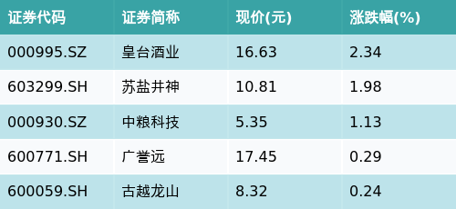 截至收盘,其它白酒主题涨跌幅最高的五只股票为:皇台酒业(000995.SZ)、苏盐井神(603299.SH)、中粮科技(000930.SZ)、广誉远(600771.SH)与古越龙山(600059.SH)。详情见下表: