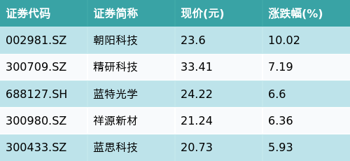 南财智讯4月23日电,天眼查数据显示,今日苹果概念主题走强,截至早盘收盘(下同)上涨2.5%。持有苹果概念主题股票的广发国证半导体芯片ETF(159801)早盘下跌0.48%,最新价报0.619元。截至上个交易日(4月22日),该基金近五个交易日净值(复权单位净值,下同)上涨1.32%,近一个月净值下跌1.21%。该基金自(20200120)成立以来净值增长率为24.4%,管理人为广发基金管理有限公司,基金经理为曹世宇。截至早盘收盘,苹果概念主题涨跌幅最高的五只股票为:朝阳科技(002981.SZ)、精研科技(300709.SZ)、蓝特光学(688127.SH)、祥源新材(300980.SZ)与蓝思科技(300433.SZ)。详情见下表: