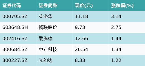 截至收盘,苹果概念主题涨跌幅最高的五只股票为:英洛华(000795.SZ)、畅联股份(603648.SH)、爱施德(002416.SZ)、中石科技(300684.SZ)与光韵达(300227.SZ)。详情见下表: