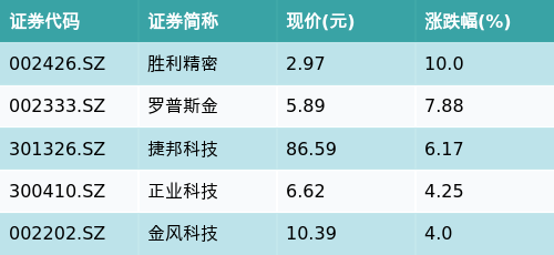 截至收盘,苹果概念主题涨跌幅最高的五只股票为:胜利精密(002426.SZ)、罗普斯金(002333.SZ)、捷邦科技(301326.SZ)、正业科技(300410.SZ)与金风科技(002202.SZ)。详情见下表: