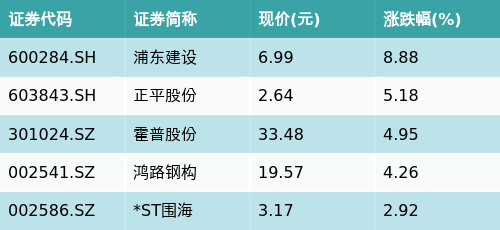 南财智讯5月13日电,天眼查数据显示,今日基建主题走强,截至早盘收盘(下同)上涨1.03%。持有基建主题股票的平安富时中国国企开放共赢ETF(159719)早盘上涨0.67%,最新价报1.505元。截至上个交易日(5月12日),该基金近五个交易日净值(复权单位净值,下同)上涨1.66%,近一个月净值上涨3.03%。该基金自(20211217)成立以来净值增长率为49.91%,管理人为平安基金管理有限公司,基金经理为刘洁倩。截至早盘收盘,基建主题涨跌幅最高的五只股票为:浦东建设(600284.SH)、正平股份(603843.SH)、霍普股份(301024.SZ)、鸿路钢构(002541.SZ)与*ST围海(002586.SZ)。详情见下表: