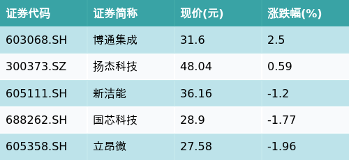 截至收盘,汽车芯片主题涨跌幅最高的五只股票为:博通集成(603068.SH)、扬杰科技(300373.SZ)、新洁能(605111.SH)、国芯科技(688262.SH)与立昂微(605358.SH)。详情见下表: