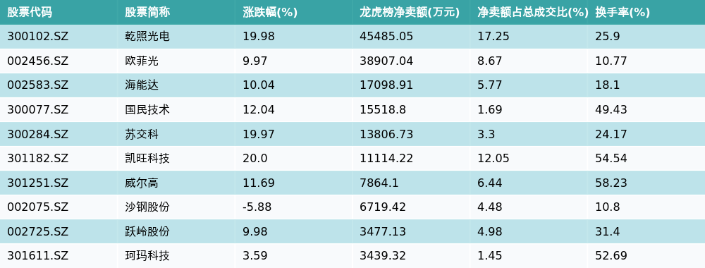 南方财经10月21日电,南财金融终端数据显示,因当日异动登上龙虎榜的个股中,龙虎榜中资金净流出最多的前三位分别是乾照光电(300102.SZ)、欧菲光(002456.SZ)与海能达(002583.SZ)。其中排名第一的乾照光电被净卖出4.55亿元,占总成交金额的17.25%。乾照光电收盘上涨19.98%,换手率为25.9%。净卖出额前10个股详情见下图: