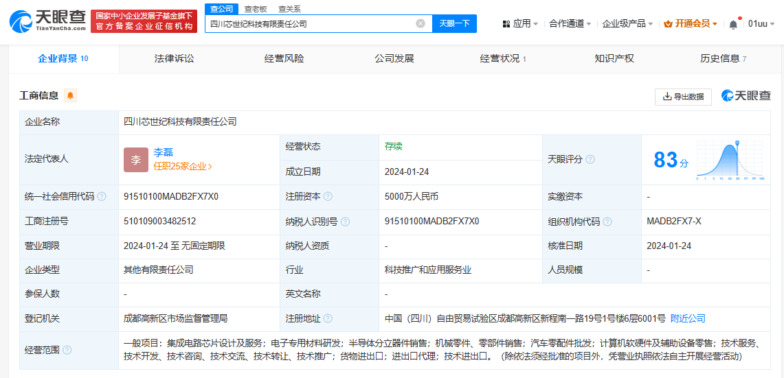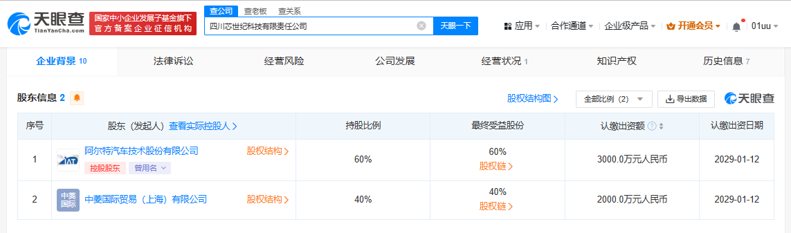 南方财经1月29日电,天眼查App显示,近日,四川芯世纪科技有限责任公司成立,法定代表人为李磊,注册资本5000万人民币,经营范围包括集成电路芯片设计及服务,电子专用材料研发,半导体分立器件销售,机械零件、零部件销售,汽车零配件批发等。股东信息显示,该公司由阿尔特(300825)、中菱国际贸易(上海)有限公司分别持股60%、40%。