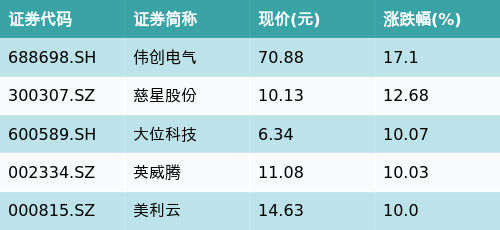 截至午间收盘,光伏概念主题涨跌幅最高的五只股票为:伟创电气(688698.SH)、慈星股份(300307.SZ)、大位科技(600589.SH)、英威腾(002334.SZ)与美利云(000815.SZ)。详情见下表: