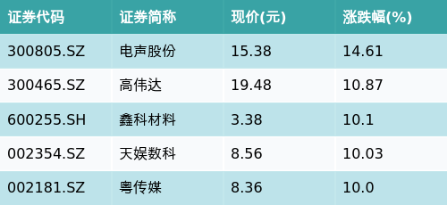 截至收盘,文化传媒主题涨跌幅最高的五只股票为:电声股份(300805.SZ)、高伟达(300465.SZ)、鑫科材料(600255.SH)、天娱数科(002354.SZ)与粤传媒(002181.SZ)。详情见下表: