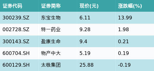 截至收盘,医疗美容主题涨跌幅最高的五只股票为:东宝生物(300239.SZ)、特一药业(002728.SZ)、盈康生命(300143.SZ)、物产中大(600704.SH)与太极集团(600129.SH)。详情见下表: