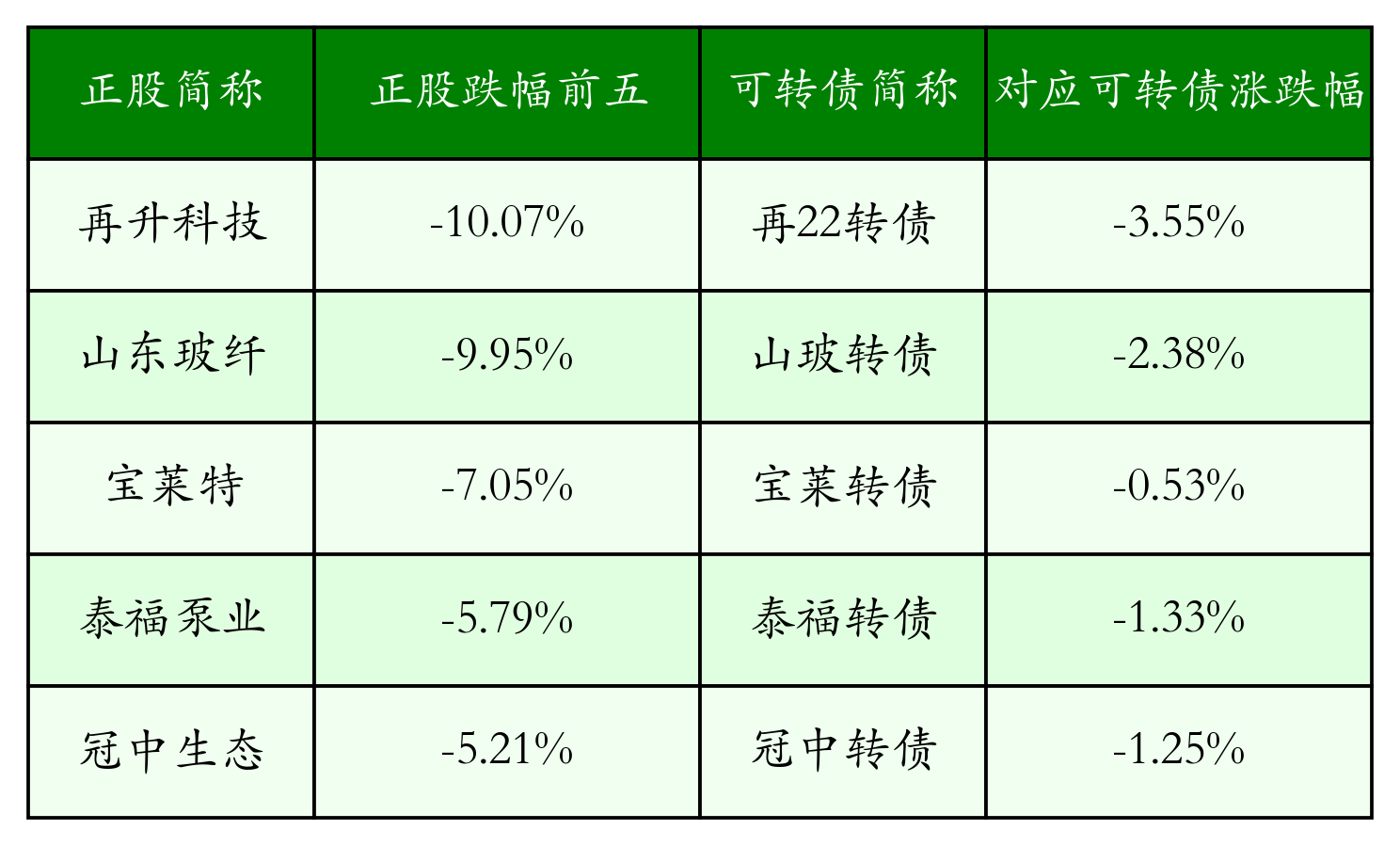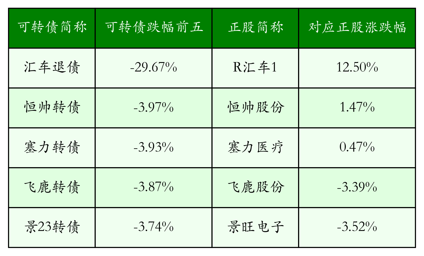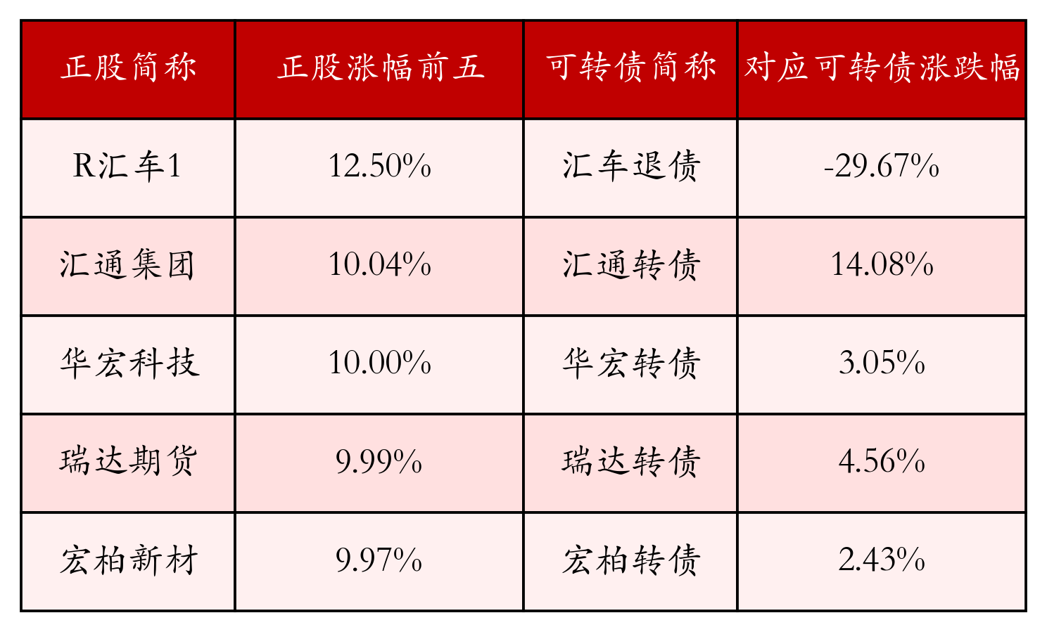 南财智讯7月11日电,南财金融终端盘后数据显示,债市方面,中证转债指数收涨0.03%,报450.85,成交额为660.69亿元。可转债方面,今日共成交469只可转债,其中306只收涨,1只收平,162只收跌。具体来看,15只可转债涨幅超过2%。其中汇通转债(113665)涨14.08%,博瑞转债(118004)涨6.93%,新致转债(118021)涨5.26%。今日有11只可转债跌幅超2%,汇车退债(404004)跌29.67%,恒帅转债(123256)跌3.97%,塞力转债(113601)跌3.93%。存在交易量的可转债所对应的正股中,234只收涨,19只收平,216只收跌。具体来看,13只可转债对应正股涨幅超过5%,其中,R汇车1(400245)涨停,收涨12.5%;汇通集团(603176)涨停,收涨10.04%;华宏科技(002645)涨停,收涨10.0%。同时所对应的可转债:汇车退债(404004)反跌29.67%;汇通转债(113665)同涨14.08%;华宏转债(127077)同涨3.05%。今日有5只可转债对应正股跌幅超过5%,再升科技(603601)跌停,收跌10.07%;山东玻纤(605006)跌停,收跌9.95%。同时所对应的可转债:再22转债(113657)同跌3.55%;山玻转债(111001)同跌2.38%。