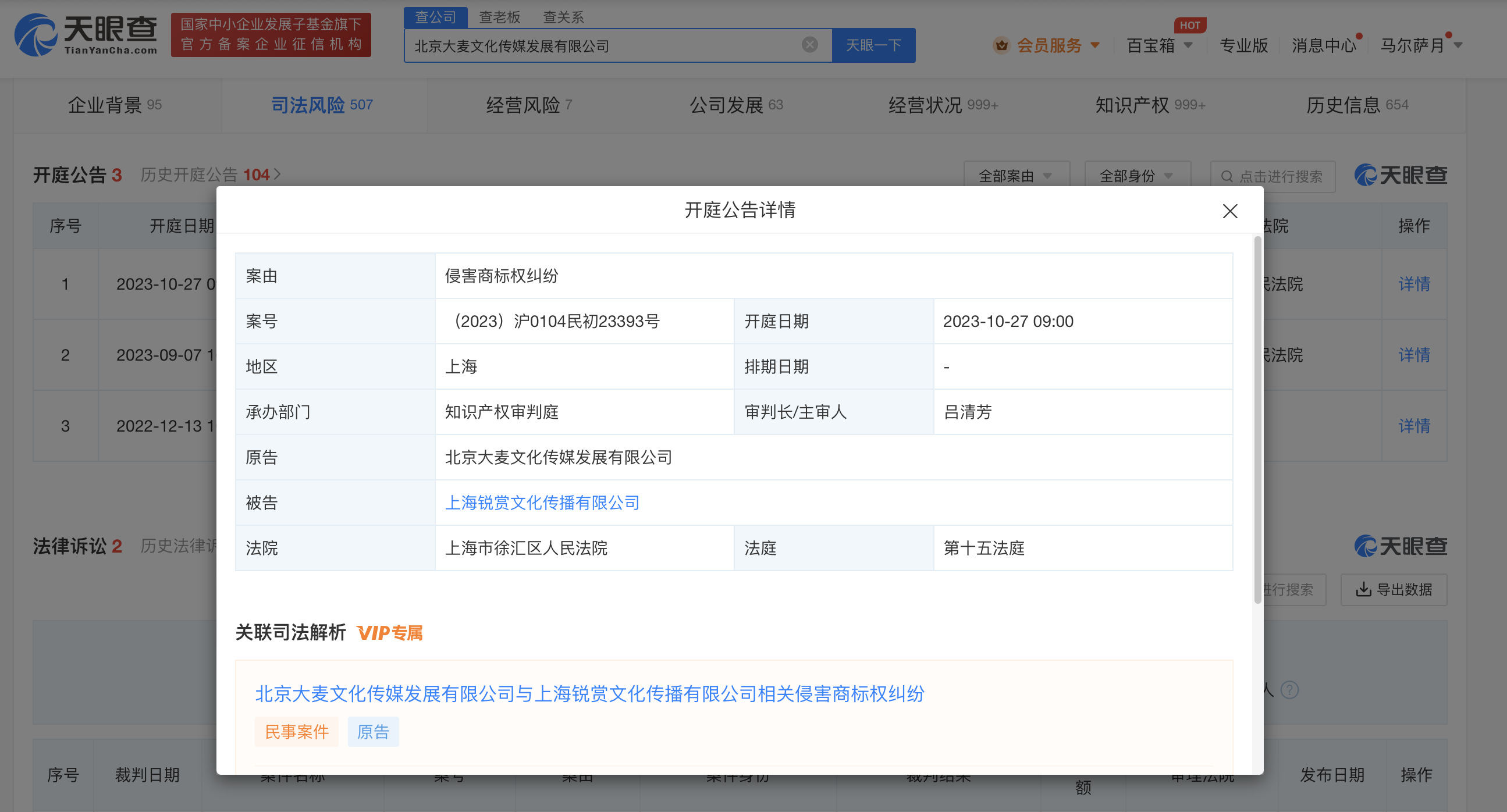 南方财经9月4日电,天眼查App显示,近日,北京大麦文化传媒发展有限公司新增一则开庭公告信息,被告为摩天轮票务关联公司上海锐赏文化传播有限公司,案由为侵害商标权纠纷,该案将于10月27日在上海市徐汇区人民法院开庭审理。