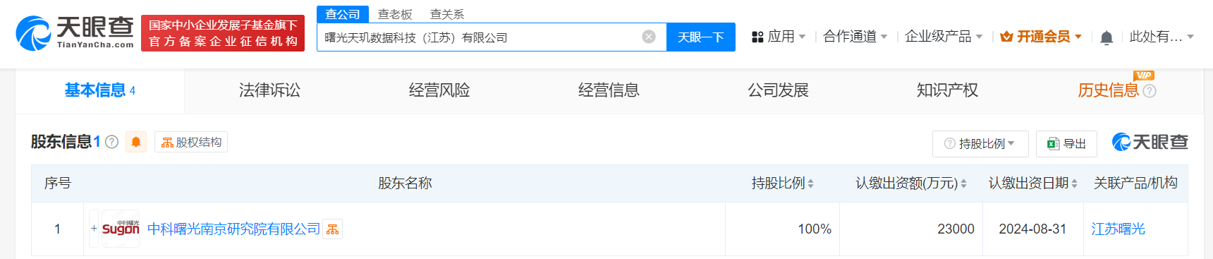 南方财经8月21日电,天眼查App显示,近日,曙光天玑数据科技(江苏)有限公司成立,法定代表人为王元兵,注册资本2.3亿人民币,经营范围含数据处理服务、软件开发、软件销售、数字技术服务、信息技术咨询服务、计算机系统服务、信息系统集成服务、计算机及通讯设备租赁、机械设备租赁等。股东信息显示,该公司由中科曙光(603019)旗下中科曙光南京研究院有限公司全资持股。