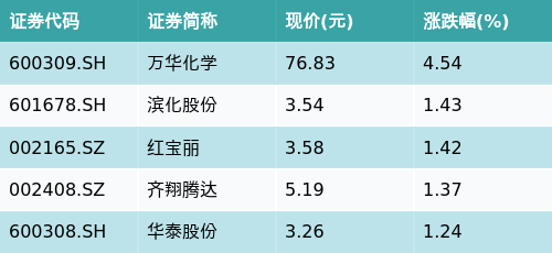 截至午间收盘,环氧丙烷主题涨跌幅最高的五只股票为:万华化学(600309.SH)、滨化股份(601678.SH)、红宝丽(002165.SZ)、齐翔腾达(002408.SZ)与华泰股份(600308.SH)。详情见下表: