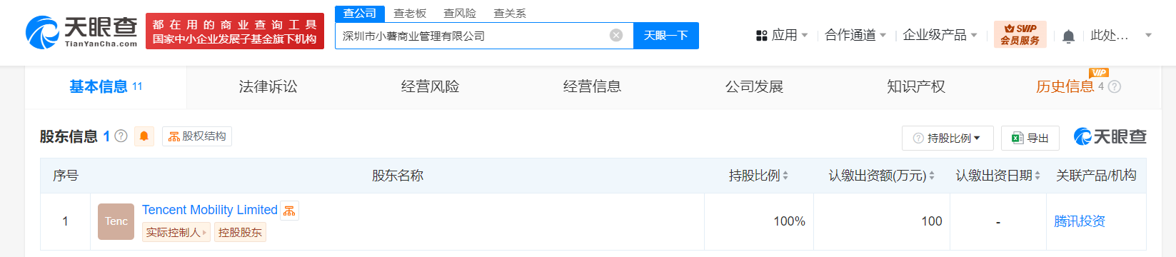 南方财经2月17日电,天眼查App显示,近日,深圳市小薯商业管理有限公司成立,法定代表人为夏尧,注册资本100万人民币,经营范围为以自有资金从事投资活动、企业管理、创业投资。股东信息显示,该公司由腾讯旗下Tencent Mobility Limited全资持股。