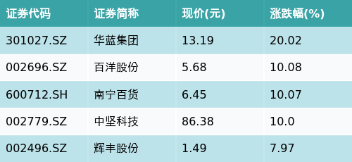 截至收盘,乡村振兴主题涨跌幅最高的五只股票为:华蓝集团(301027.SZ)、百洋股份(002696.SZ)、南宁百货(600712.SH)、中坚科技(002779.SZ)与辉丰股份(002496.SZ)。详情见下表: