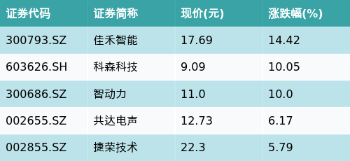 截至收盘,消费电子概念主题涨跌幅最高的五只股票为:佳禾智能(300793.SZ)、科森科技(603626.SH)、智动力(300686.SZ)、共达电声(002655.SZ)与捷荣技术(002855.SZ)。详情见下表: