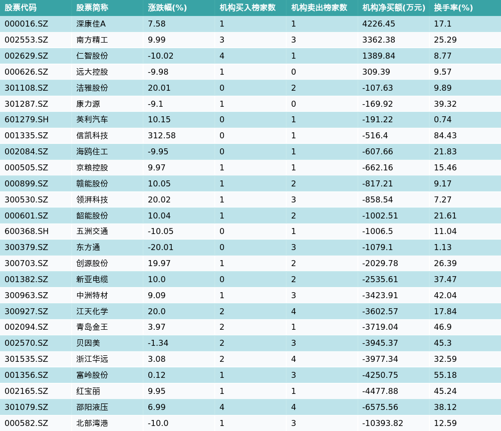 南财智讯4月15日电,南财金融终端数据显示,因当日异动登上龙虎榜的个股中,26只沪深A股龙虎榜出现了机构的身影,机构合计净卖出46662.42万元,具体来看,机构净买入4只个股,净卖出22只个股。其中,机构净买入前三分别为深康佳A(000016.SZ)、南方精工(002553.SZ)与仁智股份(002629.SZ),详情见下图: