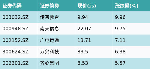 截至收盘,华为鸿蒙主题涨跌幅最高的五只股票为:传智教育(003032.SZ)、南天信息(000948.SZ)、广电运通(002152.SZ)、万兴科技(300624.SZ)与齐心集团(002301.SZ)。详情见下表: