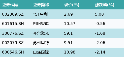 截至收盘,HJT电池主题涨跌幅最高的五只股票为:*ST中利(002309.SZ)、明阳智能(601615.SH)、帝尔激光(300776.SZ)、苏州固锝(002079.SZ)与山煤国际(600546.SH)。详情见下表: