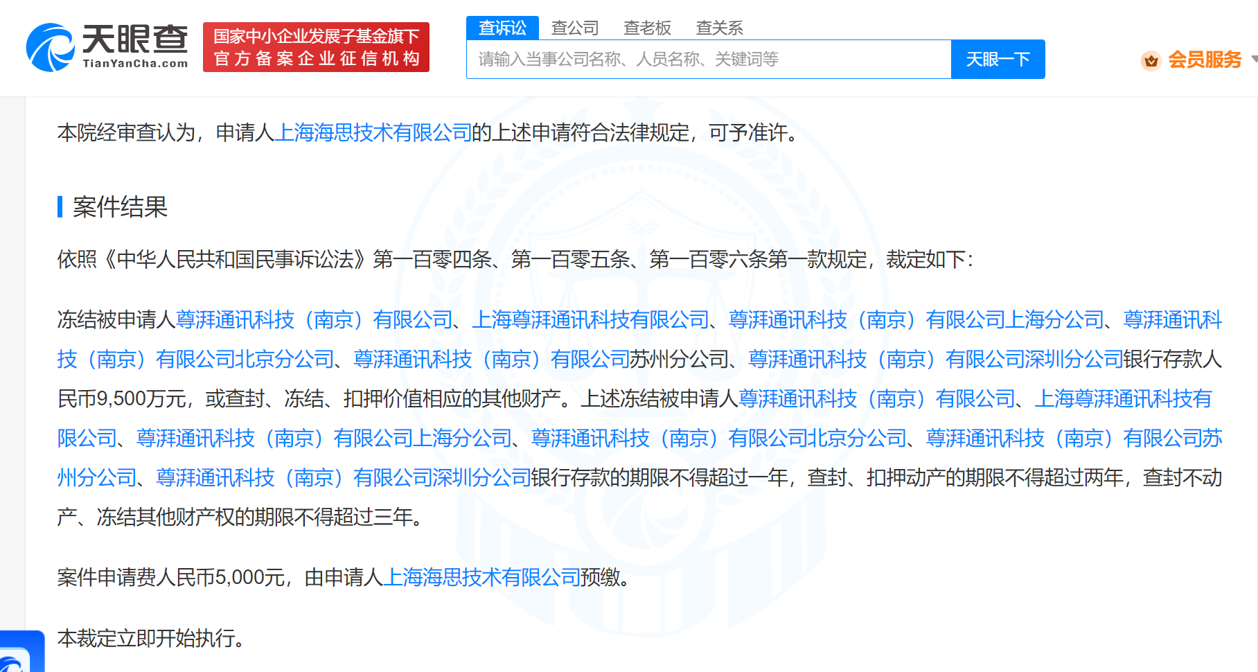 南方财经8月23日电,天眼查App显示,近日,上海海思技术有限公司与尊湃通讯科技(南京)有限公司等申请诉前财产保全一审非诉保全审查裁定书公开。文书显示,申请人上海海思技术有限公司向法院申请诉前财产保全,请求冻结被申请人尊湃通讯科技(南京)有限公司及其上海、北京、苏州、深圳分公司和子公司上海尊湃通讯科技有限公司银行存款9500万元,或查封、冻结、扣押价值相应的其他财产。法院审查认为上述申请符合法律规定,裁定执行。天眼查显示,上海海思技术有限公司由华为技术有限公司全资持股,尊湃通讯科技(南京)有限公司由上海琨昊企业管理合伙企业(有限合伙)、张琨、瀚星创业投资有限公司等共同持股。据官网显示, 尊湃通讯是一家以高端芯片设计为主的高科技公司。