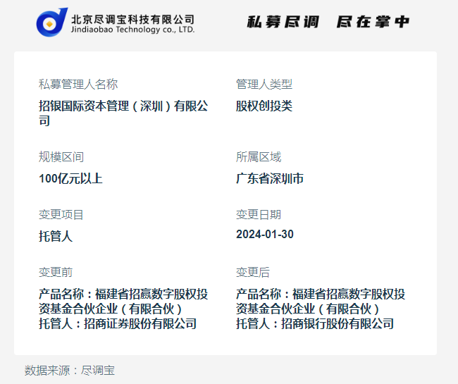 招银国际资本管理(深圳)有限公司旗下产品福建省招赢数字股权投资基金合伙企业(有限合伙)发生托管人变更