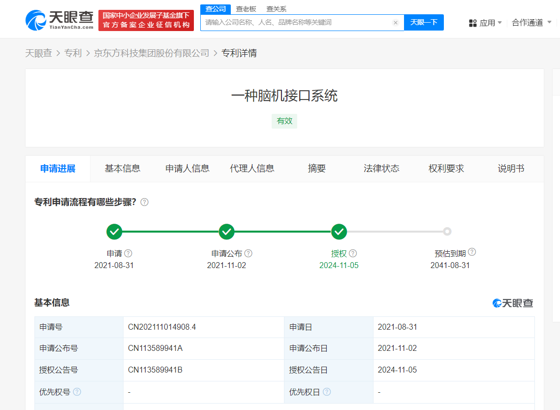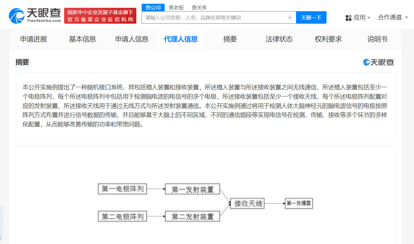 南方财经11月6日电,天眼查知识产权信息显示,近日,京东方科技集团股份有限公司、北京京东方技术开发有限公司申请的“一种脑机接口系统”专利获授权。摘要显示,本专利包括植入装置和接收装置,所述植入装置与所述接收装置之间无线通信,所述植入装置包括用于检测脑电波的电信号的多个电极,所述接收装置包括至少一个接收天线,通过将用于检测人体大脑神经元的脑电波信号的电极按照阵列方式布置并进行信号数据的传输,并且能够基于大脑上的不同区域、不同的通信频段等实现电信号在检测、传输、接收等多个环节的多样化配置,从而能够改善传输的功率和带宽问题。