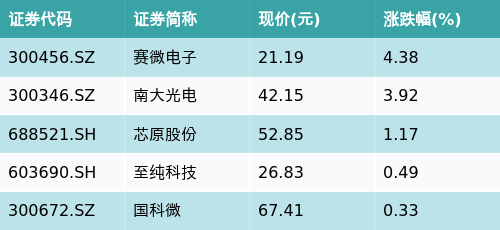 截至收盘,国家大基金持股主题涨跌幅最高的五只股票为:赛微电子(300456.SZ)、南大光电(300346.SZ)、芯原股份(688521.SH)、至纯科技(603690.SH)与国科微(300672.SZ)。详情见下表: