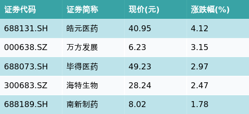 截至收盘,CRO/CMO主题涨跌幅最高的五只股票为:皓元医药(688131.SH)、万方发展(000638.SZ)、毕得医药(688073.SH)、海特生物(300683.SZ)与南新制药(688189.SH)。详情见下表: