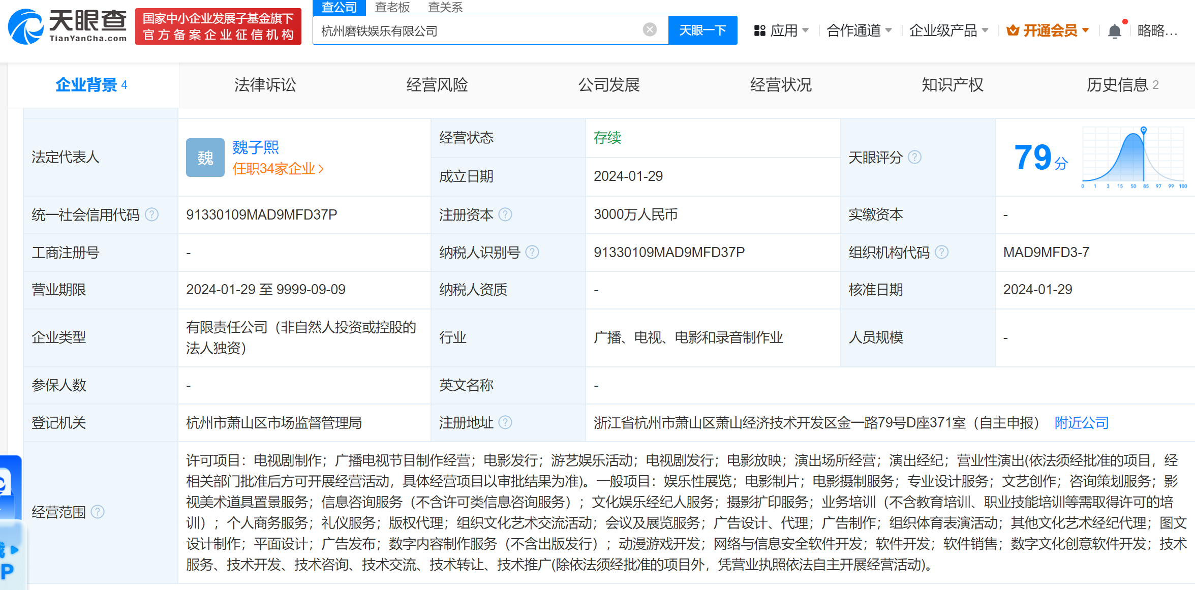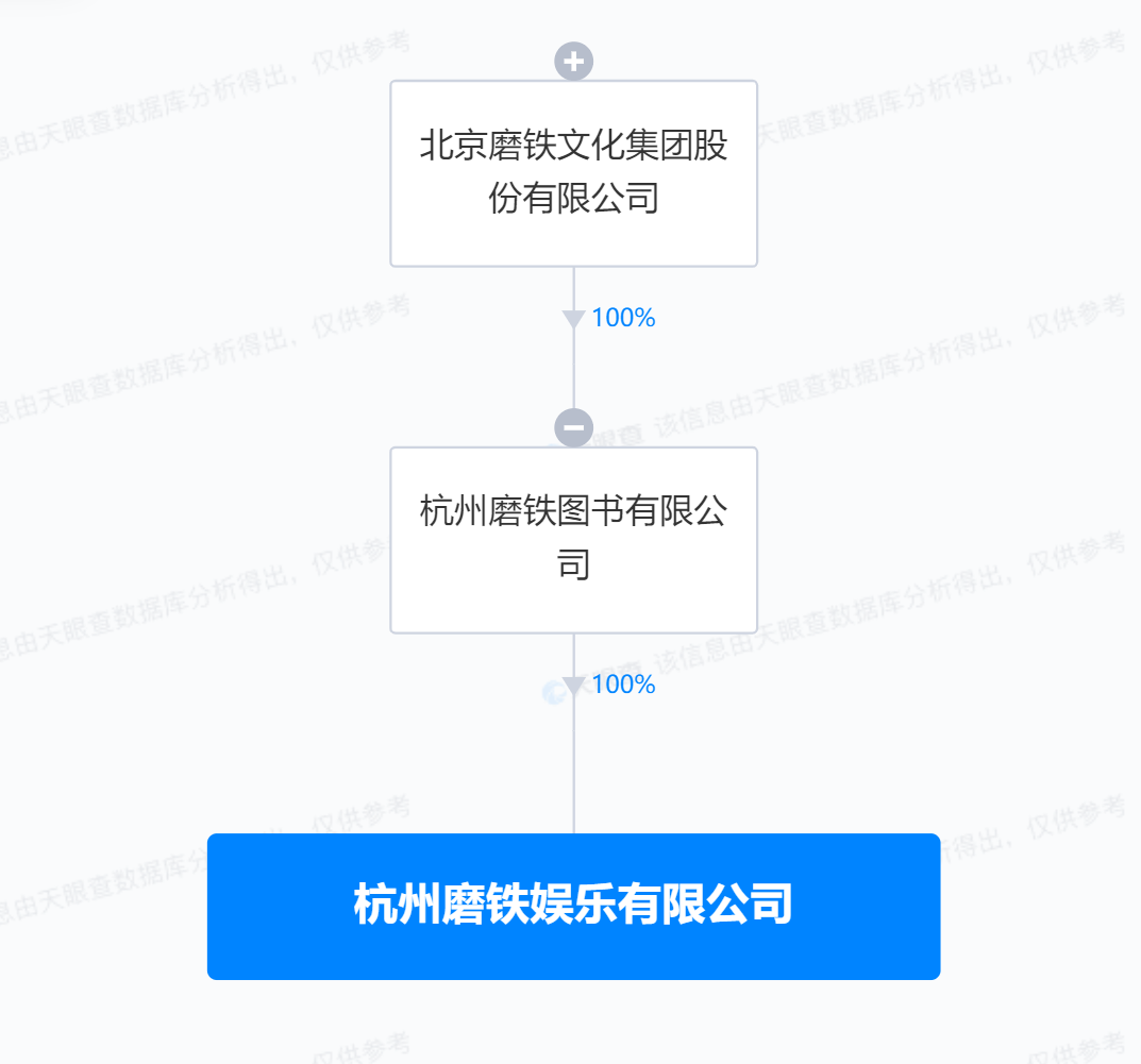 南方财经2月1日电,天眼查App显示,近日,杭州磨铁娱乐有限公司成立,法定代表人为魏子熙,注册资本3000万人民币,经营范围含电视剧制作、广播电视节目制作经营、演出经纪、营业性演出、动漫游戏开发等。股权全景穿透图显示,该公司由北京磨铁文化集团股份有限公司间接全资持股,后者第一大股东为阿里文娱旗下优酷信息技术(北京)有限公司。