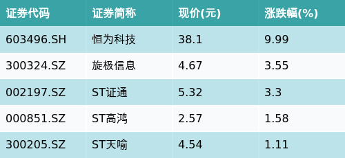 截至收盘,网络安全主题涨跌幅最高的五只股票为:恒为科技(603496.SH)、旋极信息(300324.SZ)、ST证通(002197.SZ)、ST高鸿(000851.SZ)与ST天喻(300205.SZ)。详情见下表: