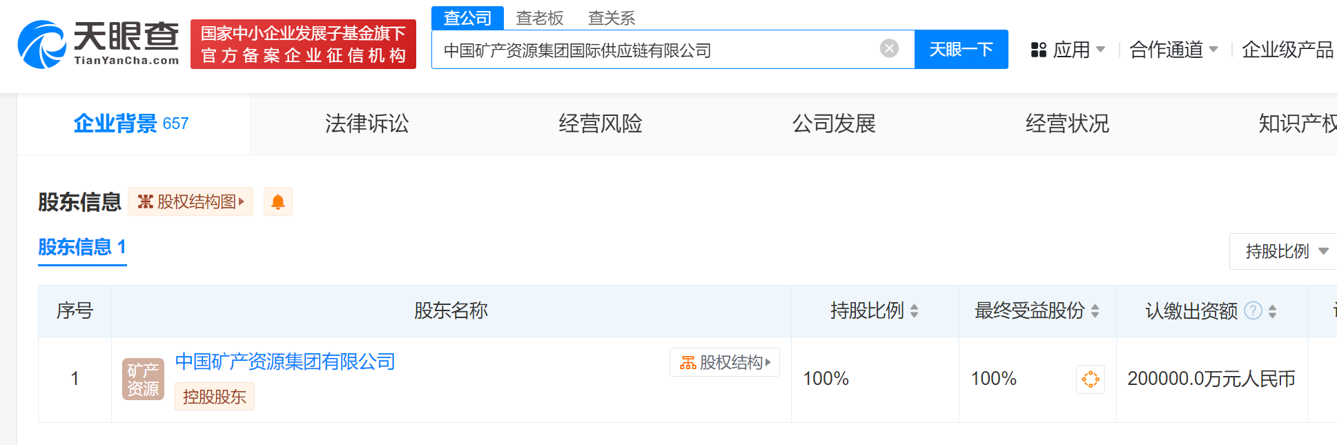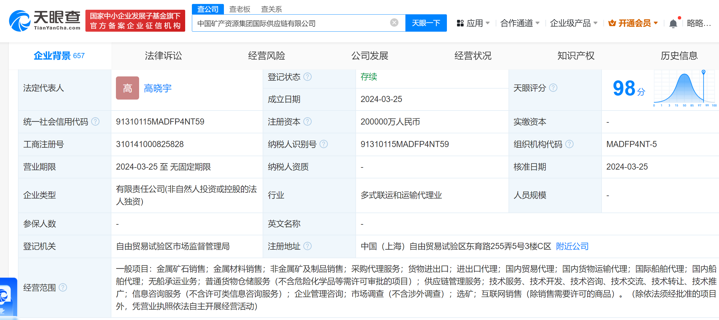 南方财经3月26日电,天眼查App显示,近日,中国矿产资源集团国际供应链有限公司成立,法定代表人为高晓宇,注册资本20亿人民币,经营范围含金属矿石销售,金属材料销售,非金属矿及制品销售,货物进出口,国际、国内船舶代理,选矿,互联网销售等。股东信息显示,该公司由中国矿产资源集团有限公司全资持股。