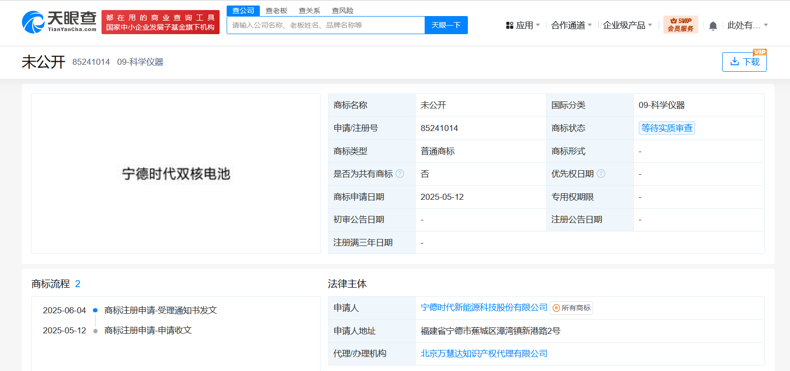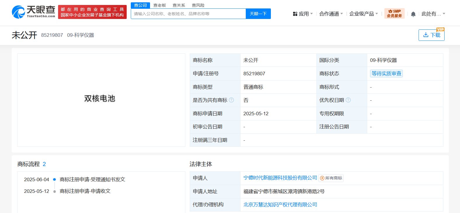 宁德时代申请注册双核电池商标
