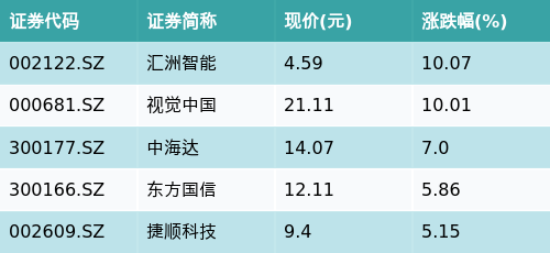 截至收盘,大数据基础设施主题涨跌幅最高的五只股票为:汇洲智能(002122.SZ)、视觉中国(000681.SZ)、中海达(300177.SZ)、东方国信(300166.SZ)与捷顺科技(002609.SZ)。详情见下表: