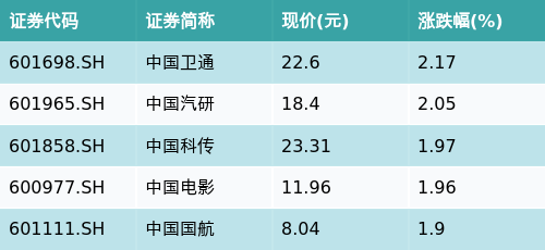 截至收盘,中字头主题涨跌幅最高的五只股票为:中国卫通(601698.SH)、中国汽研(601965.SH)、中国科传(601858.SH)、中国电影(600977.SH)与中国国航(601111.SH)。详情见下表:
