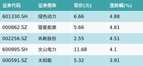 截至收盘,绿色电力主题涨跌幅最高的五只股票为:绿色动力(601330.SH)、银星能源(000862.SZ)、兆新股份(002256.SZ)、文山电力(600995.SH)与太阳能(000591.SZ)。详情见下表: