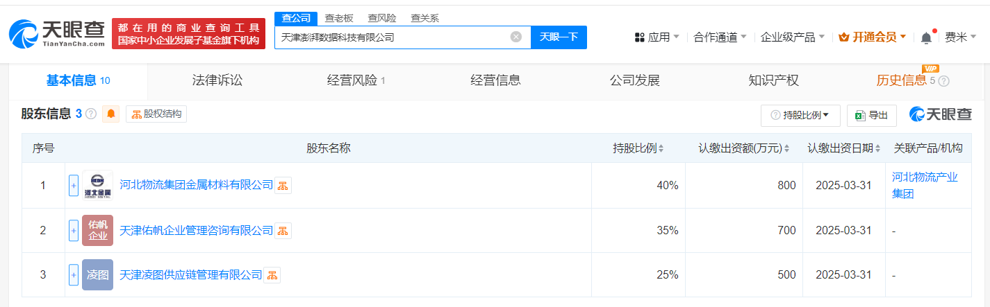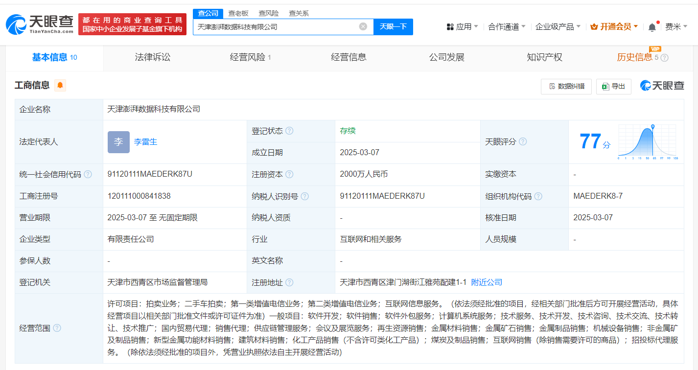 天津澎湃数据科技公司登记成立 注册资本2000万