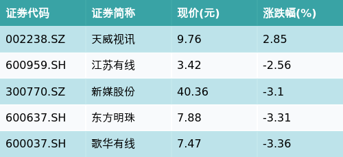 截至收盘,电视广播主题涨跌幅最高的五只股票为:天威视讯(002238.SZ)、江苏有线(600959.SH)、新媒股份(300770.SZ)、东方明珠(600637.SH)与歌华有线(600037.SH)。详情见下表: