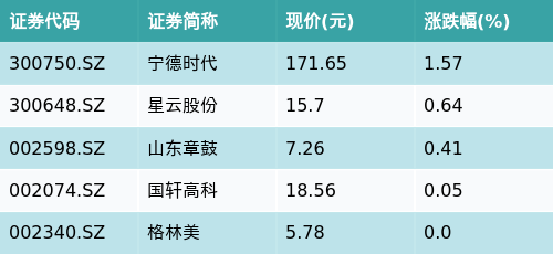 截至午间收盘,固态电池主题涨跌幅最高的五只股票为:宁德时代(300750.SZ)、星云股份(300648.SZ)、山东章鼓(002598.SZ)、国轩高科(002074.SZ)与格林美(002340.SZ)。详情见下表: