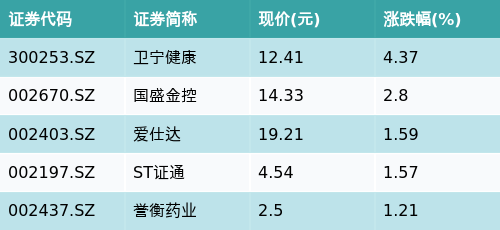 截至收盘,互联网保险主题涨跌幅最高的五只股票为:卫宁健康(300253.SZ)、国盛金控(002670.SZ)、爱仕达(002403.SZ)、ST证通(002197.SZ)与誉衡药业(002437.SZ)。详情见下表: