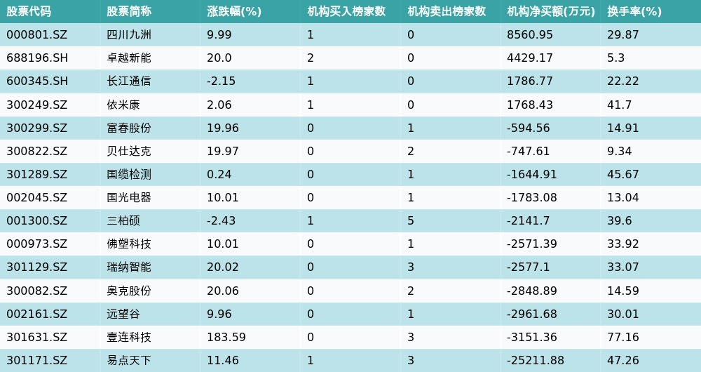机构净卖出的个股中,前三分别为易点天下(301171.SZ)、壹连科技(301631.SZ)与远望谷(002161.SZ)。