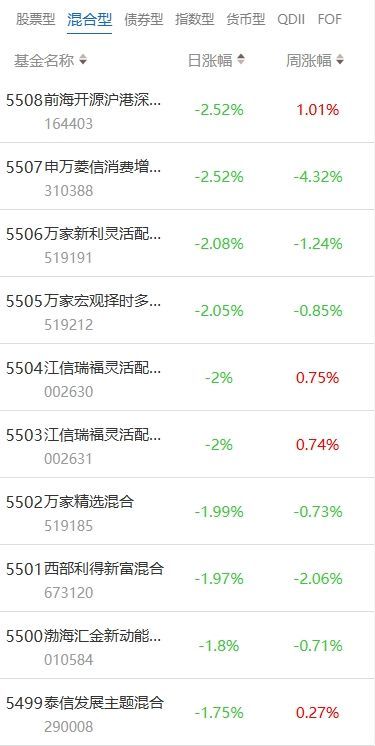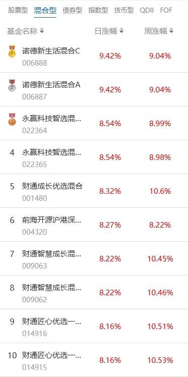 2025年7月15日当日收益靠前的混合型基金包括:诺德新生活混合型证券投资基金(006888,日收益9.42%);永赢科技智选混合型发起式证券投资基金(022364,日收益8.54%);财通成长优选混合型证券投资基金(001480,日收益8.32%)等。收益较低的混合型基金包括:前海开源沪港深农业主题精选灵活配置混合型证券投资基金(LOF)(164403,日收益-2.52%);申万菱信消费增长混合型证券投资基金(310388,日收益-2.52%);万家新利灵活配置混合型证券投资基金(519191,日收益-2.08%)等。
