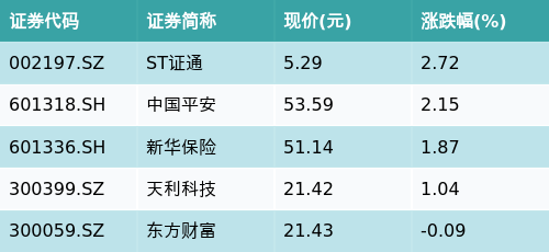 南财智讯5月14日电,天眼查数据显示,今日互联网保险主题走强,截至早盘收盘(下同)上涨1.09%。持有互联网保险主题股票的南方中证全指证券公司ETF(512900)早盘上涨0.48%,最新价报1.055元。截至上个交易日(5月13日),该基金近五个交易日净值(复权单位净值,下同)上涨1.47%,近一个月净值上涨3.17%。该基金自(20170310)成立以来净值增长率为5.09%,管理人为南方基金管理股份有限公司,基金经理为孙伟。截至早盘收盘,互联网保险主题涨跌幅最高的五只股票为:ST证通(002197.SZ)、中国平安(601318.SH)、新华保险(601336.SH)、天利科技(300399.SZ)与东方财富(300059.SZ)。详情见下表: