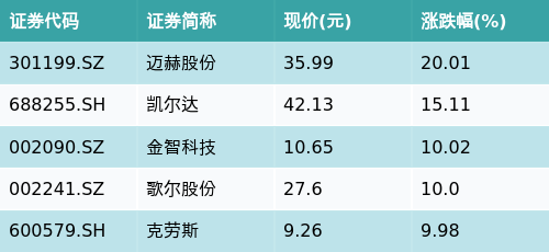 截至午间收盘,机器人概念主题涨跌幅最高的五只股票为:迈赫股份(301199.SZ)、凯尔达(688255.SH)、金智科技(002090.SZ)、歌尔股份(002241.SZ)与克劳斯(600579.SH)。详情见下表: