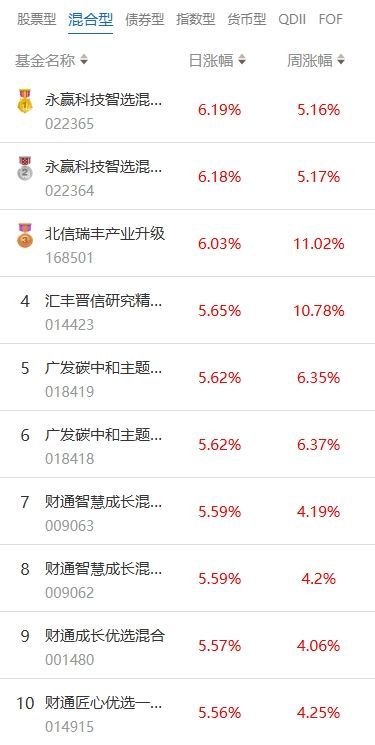 南方财经7月9日电,根据南财基金通数据:2025年07月08日当日收益靠前的混合型基金包括:永赢科技智选混合型发起式证券投资基金(022365,日收益6.19%);北信瑞丰产业升级多策略混合型证券投资基金(168501,日收益6.03%);汇丰晋信研究精选混合型证券投资基金(014423,日收益5.65%)等。收益较低的混合型基金包括:长城医疗保健混合型证券投资基金(015562,日收益-2.47%);富国精准医疗灵活配置混合型证券投资基金(005176,日收益-2.28%);长城医药科技六个月持有期混合型证券投资基金(011673,日收益-2.24%)等。