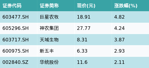 截至早盘收盘,猪肉主题涨跌幅最高的五只股票为:巨星农牧(603477.SH)、神农集团(605296.SH)、天域生物(603717.SH)、新五丰(600975.SH)与华统股份(002840.SZ)。详情见下表: